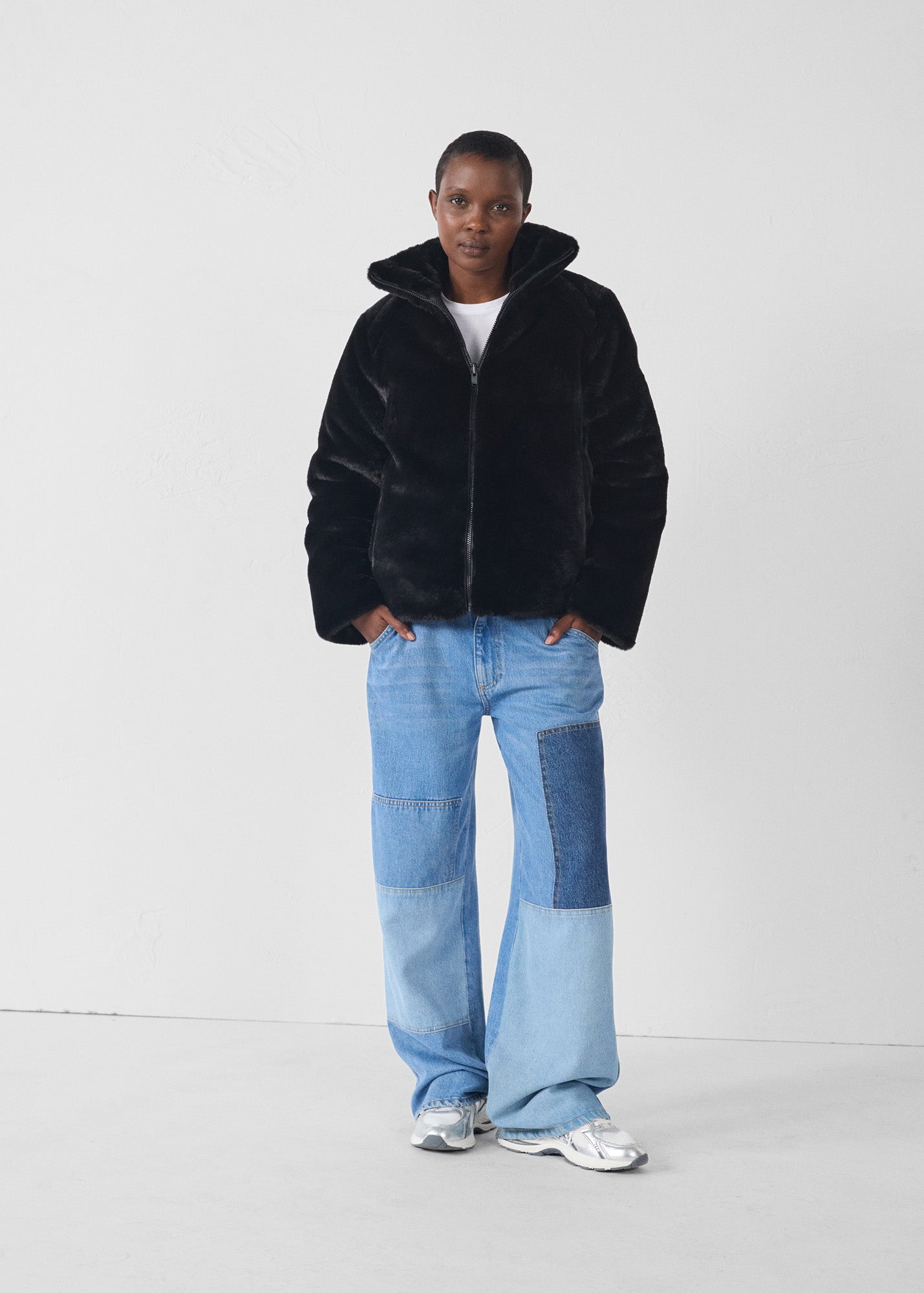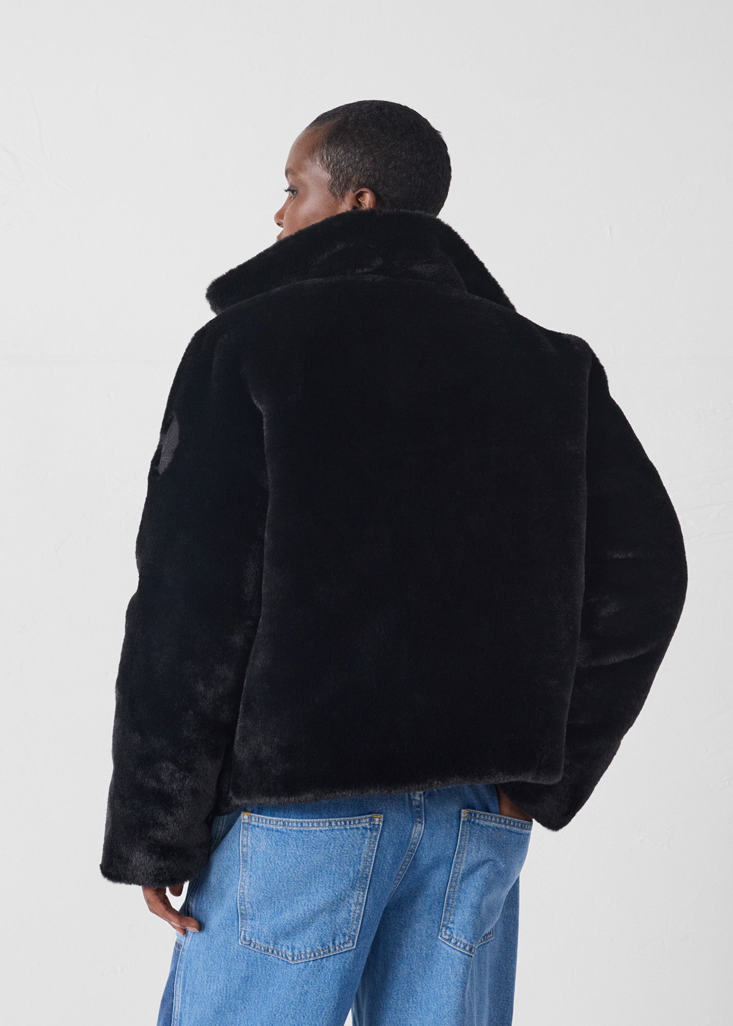 - Doudoune réversible : fausse fourrure (côté A) et tissu iconique en polyamide (côté B)