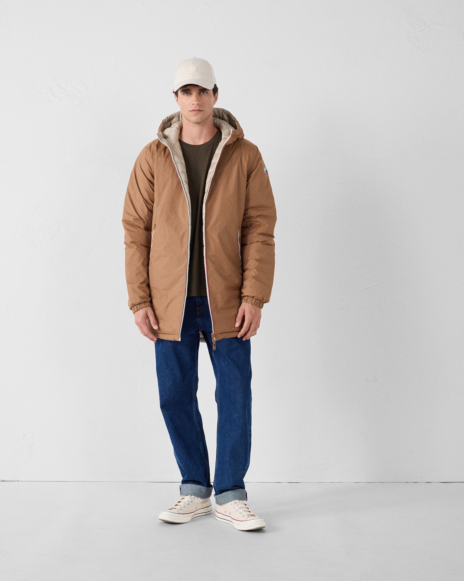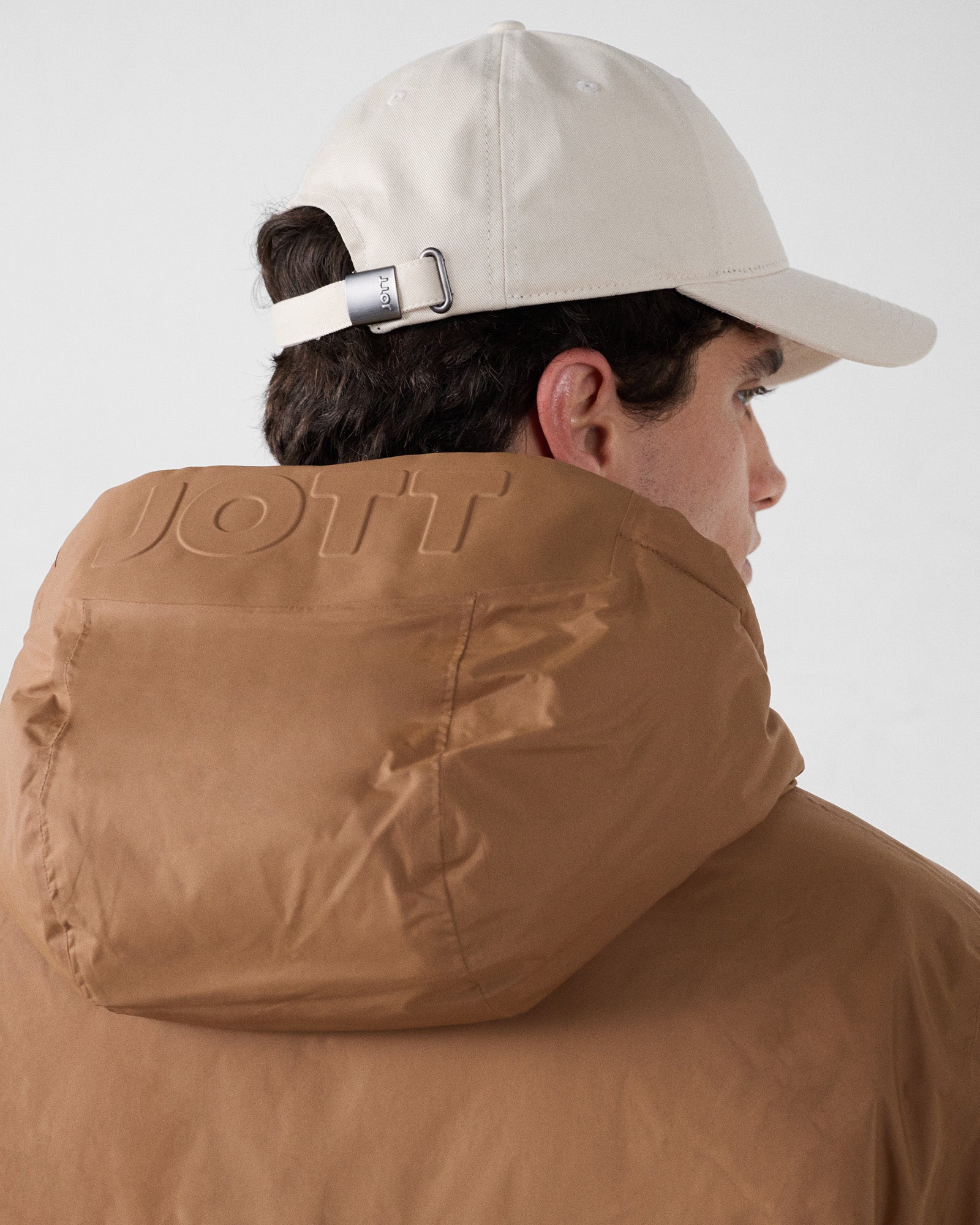 - Face A : tissu imperméable, deux poches latérales zippées, capuche embossée 'JOTT'