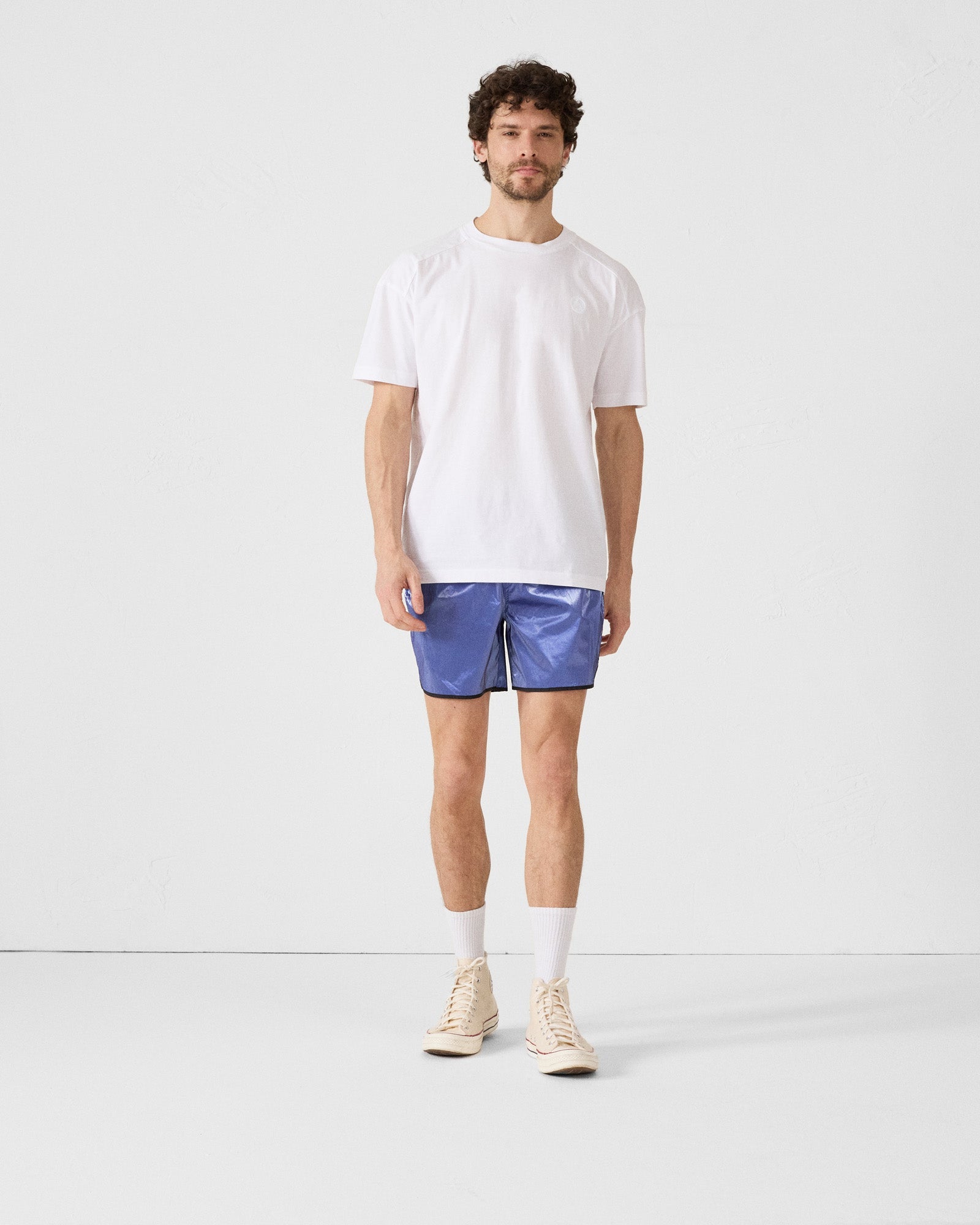 Pensé comme une pièce statement, ce short de bain marathon en tissu métallisé impose un look audacieux. Sa ceinture élastique avec cordons de serrage assure un confort optimal, tandis que ses détails noirs contrastés signent une allure résolument sportive. Un modèle qui capte la lumière autant que les regards.